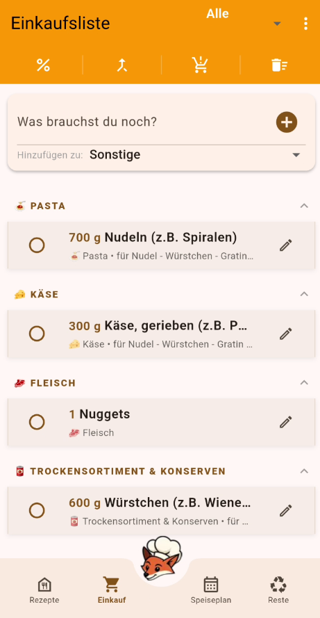 Jeder Supermarkt ist anders aufgebaut. Damit du beim Einkaufen nicht ständig Kreuz und Quer durch den Laden rennen musst, bietet dir der KitchenFox die Möglichkeit, deine Lieblings-Supermärkte mit ihren individuellen Laufwegen anzulegen. Und das Beste: Unsere Einkaufs-Assistentin Madame Claire sortiert deine Einkaufsliste dann völlig automatisch in der perfekten Reihenfolge!