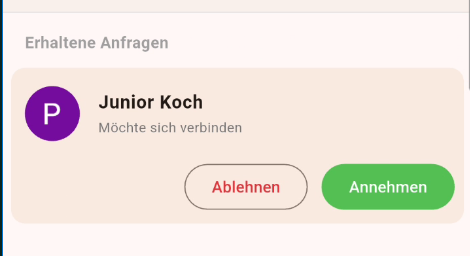 • Anfragen verwalten: Wenn dich jemand hinzufügen möchte, siehst du das unter „Eingegangene Anfragen“. Du entscheidest: Annehmen öffnet den Rezepttausch, Ablehnen lässt den digitalen Riegel vor der Tür.